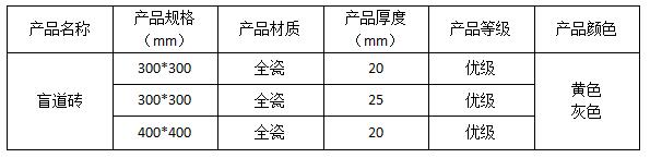 盲道磚顏色:橘色盲道磚,桔色盲道磚,深灰盲道磚,中黃盲道磚,乳白盲道磚(定制),綠色盲道磚(定制),材質(zhì)為瓷磚質(zhì)。
